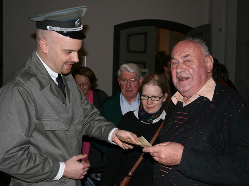 Erst nach Umrundung von Panzersperren und mit abgestempeltem Passierschein konnten sich die Besucher den Ausstellungsräumen nähern. Die spontane Uniformspende eines ehemaligen DDR-Bürgers für den "Grenzbeamten" ließ Erinnerungen an den Transitverkehr aufleben.