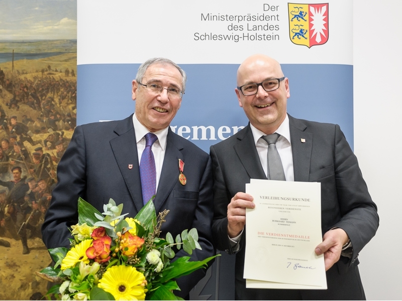 Stellvertretend für Bundespräsident Joachim Gauck hat Torsten Albig, Ministerpräsident des Landes Schleswig-Holstein am 6. Januar 2014 den Pinneberger Kreispräsidenten Burkhard E. Tiemann mit der Verdienstmedaille des Verdienstordens der Bundesrepublik Deutschland ausgezeichnet. Die Zeremonie fand in Anwesenheit von Landrat Oliver Stolz, Silke Krieger, Stellvertretende Bürgermeisterin der Gemeinde Kummerfeld, Michael Behrens, Lebenshilfe-Geschäftsführer sowie Tiemanns Familie statt.