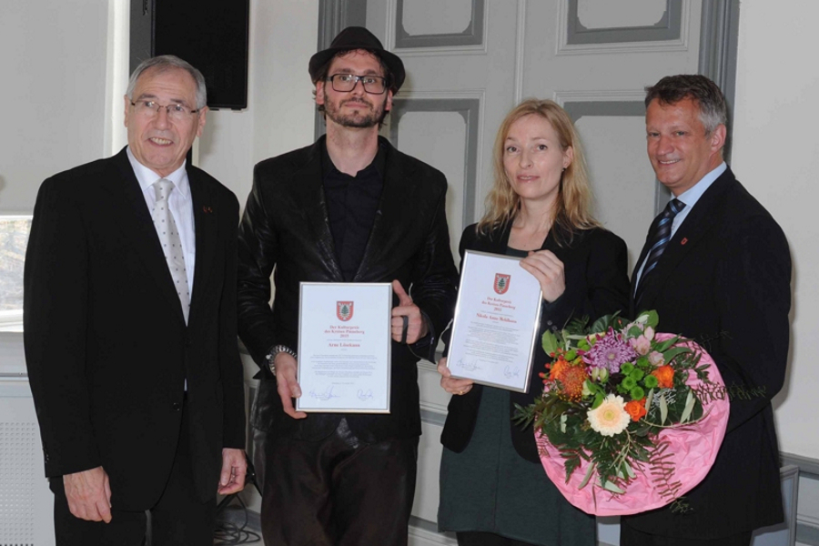 Bildinformation: Kreispräsident Burkhard E. Tiemann (links) und Landrat Oliver Stolz (rechts) übergeben den Kreiskulturpreis an Nikola Anne Mehlhorn und Arne Lösekann
