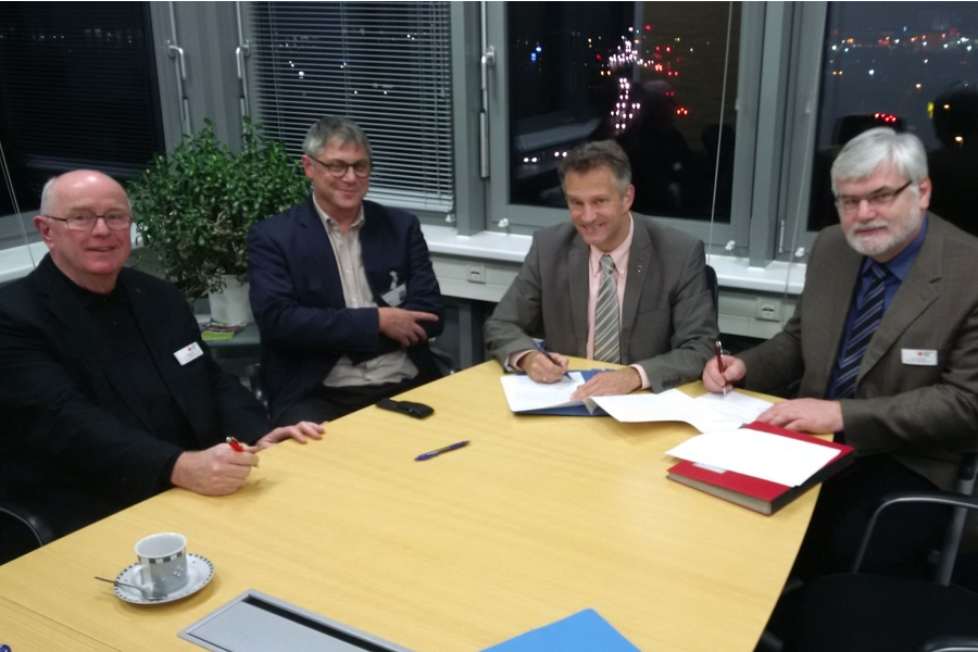 Michael Reis von der Rettungsdienstkooperation in Schleswig-Holstein (RKiSH gGmbH), Wolfgang Krohn, Vorsitzender des Kreisverbandsvorstand des Deutschen Roten Kreuz des Kreisverbandes Pinneberg e.V., Kreisgeschäftsführer Reinhold Kinle vom DRK und Landrat Oliver Stolz unterzeichneten einige Verträge für eine vertiefende Zusammenarbeit zwischen Kreis, DRK und RKiSH.