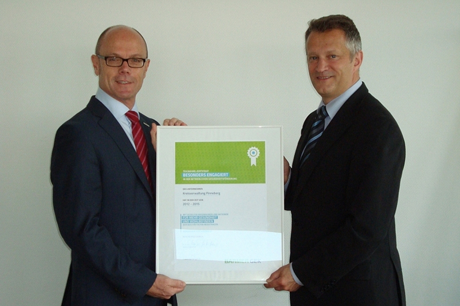 Mit der Überreichung eines Zertifikates an Landrat Oliver Stolz durch Werner Siedenhans ist die systematische Einführung des Betrieblichen Gesundheitsmanagements mit Unterstützung der Barmer GEK nun erfolgreich abgeschlossen.