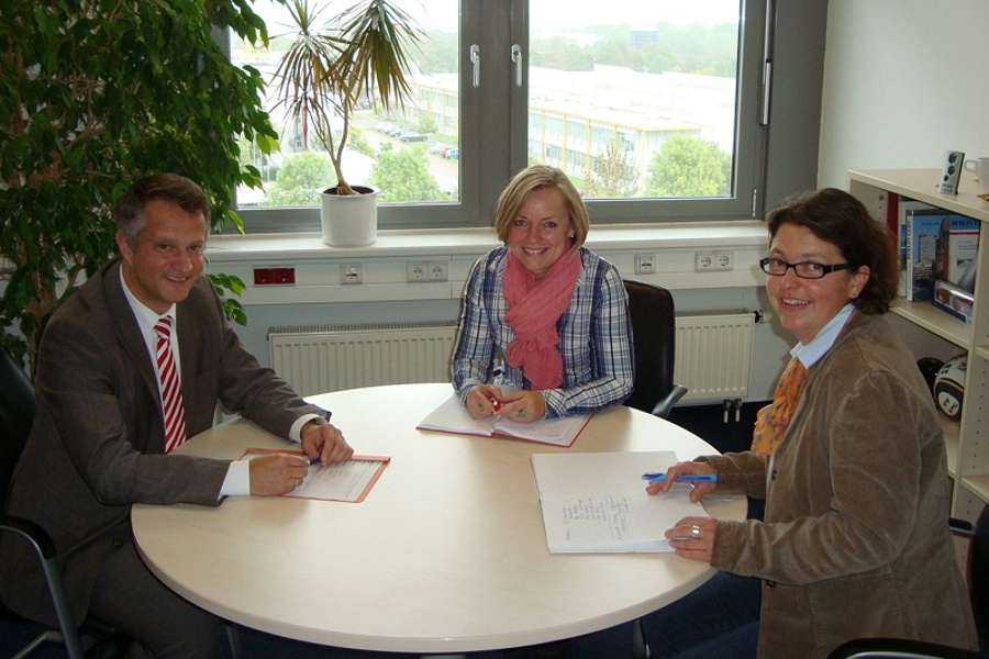 Bildinformation: (v.l.n.r.) Landrat Oliver Stolz, Birgit Köhnke (50, Dipl.-Verwaltungswirtin), Silke Linne (41, Dipl.-Verwaltungswirtin), nicht im Bild Frank Schütz