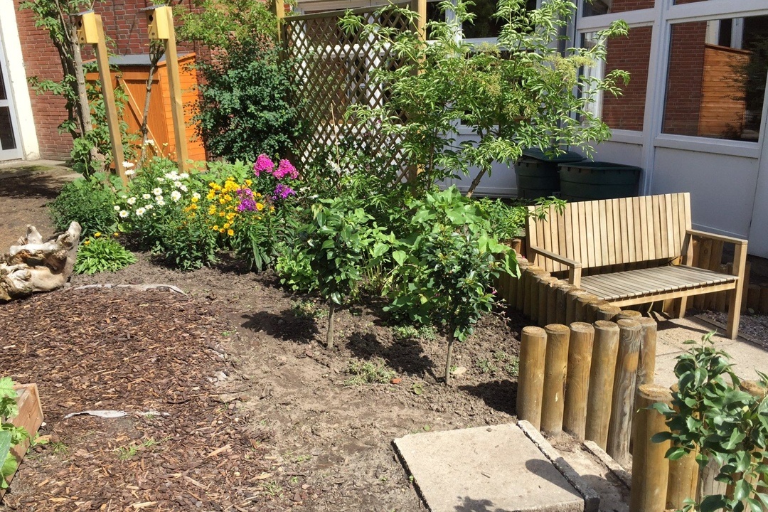 Innerhalb der letzten drei Monate wurde fleißig Unkraut gejätet, gezimmert, Palisaden zu einer kleinen Sitzecke zusammengefügt, ein Schuppen für die Gartengeräte entstand und die ersten Pflanzen wurden in die Erde gesetzt. Aus dem alten, jahrelang brach gelegenem Schulgarten ist wieder ein Ort der Fröhlichkeit geworden. Bunte Klassenbeete schmücken nun das Bild. Büsche, Blühstauden und Nistkästen sollen Vögel anlocken, sodass man sie beim Nisten beobachten kann. In der neuen Sitz-Ecke soll demnächst der „Garten-Rat“ tagen und über zukünftige Entscheidungen beraten.