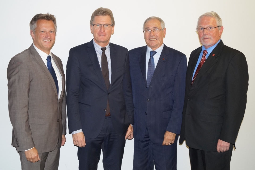 Bildbinformation: (v.l.n.r.) Landrat Oliver Stolz; Dr. Bernd Buchholz, Minister für Wirtschaft, Verkehr, Arbeit, Technologie und Tourismus des Landes Schleswig-Holstein; Kreispräsident Burkhard E. Tiemann; Helmut Ahrens, Vorsitzender des Ausschusses für Wirtschaft, Regionalentwicklung und Verkehr des Kreises Pinneberg