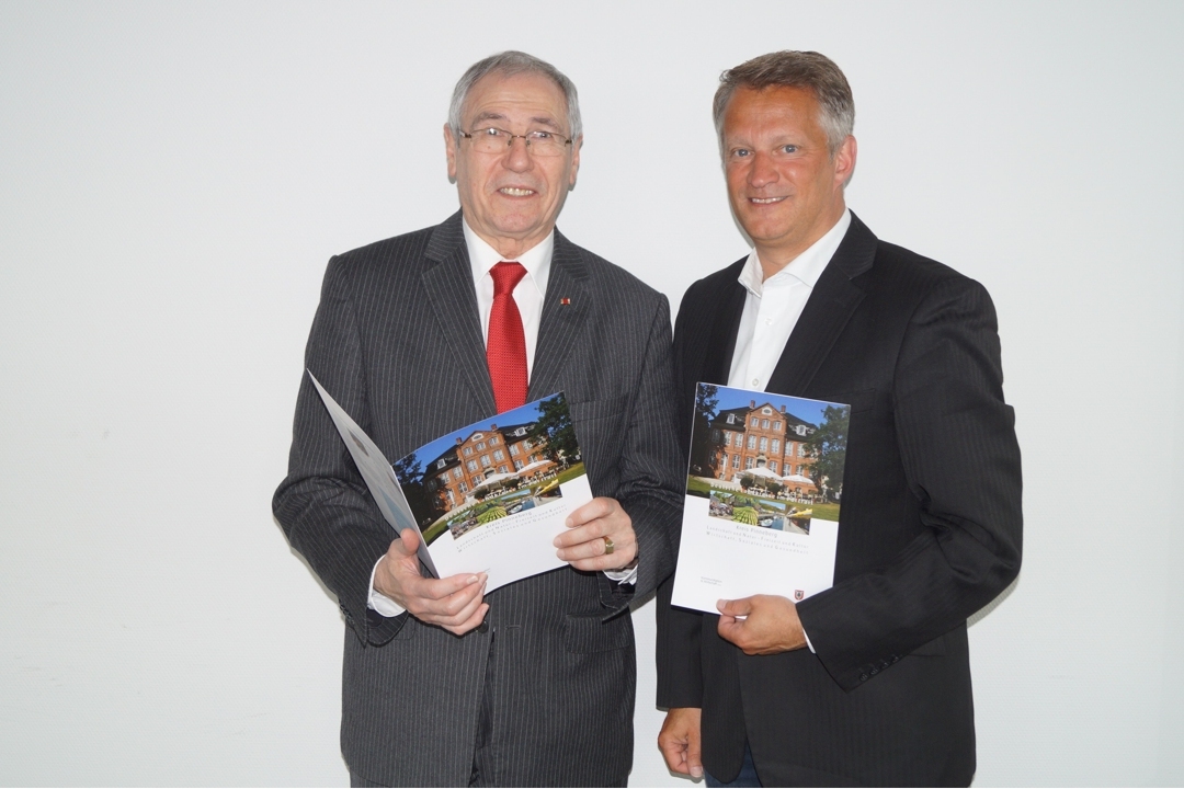 Kreispräsident Burkhard E. Tiemann (links) und Landrat Oliver Stolz mit dem Infoflyer des neuen Kreisbuches