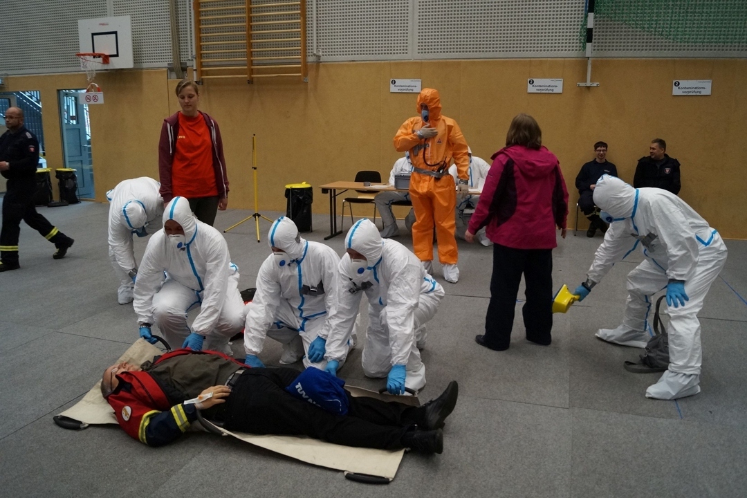 Bei der Übung im Gymnasium wurden rund 70 Teilnehmer durch die Notfallstation „aufgenommen, untersucht und ggfs. behandelt“. Die Übungsteilnehmer waren Bestandteil des fiktiven Szenarios „kerntechnischer Unfall im AKW Nord“. Die Teilnehmer bekamen einen kurzen Lebenslauf an die Hand, wann sie sich wie lange im gefährdeten Gebiet in Norddeutschland aufgehalten haben. Einige Teilnehmer waren somit auch einer fiktiven radioaktiven Belastung ausgesetzt. Daraus resultierten dann unterschiedliche Untersuchungen und Wege innerhalb der Notfallstation, dass Spektrum reichte von sofortiger Entlassung (keine Belastung) über verschiedene Stufen der Dekontamination - vom einfachen Händewaschen bis zur Dusche - bis zum Weitertransport in eine Klinik.