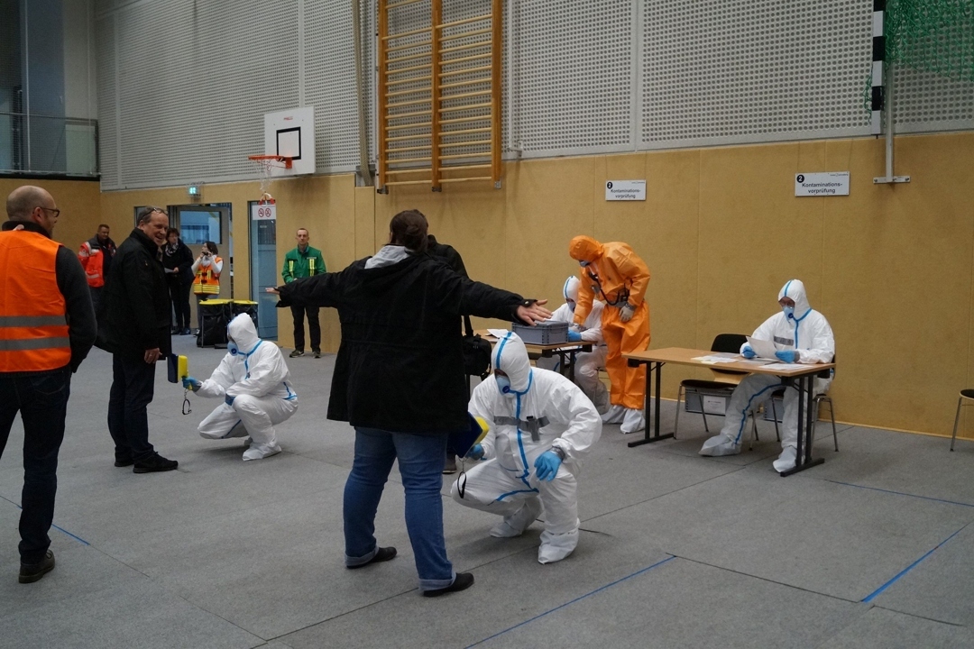 Einzige Panne während der Übung: Für wenige Minuten zwischendurch gab es kein Wasser zum Duschen und Händewaschen, dank der tatkräftigen Unterstützung des Hausmeisters (der vor Ort war, dies hatte die Stadt Quickborn im Vorwege sichergestellt) wurde das Problem schnell behoben.