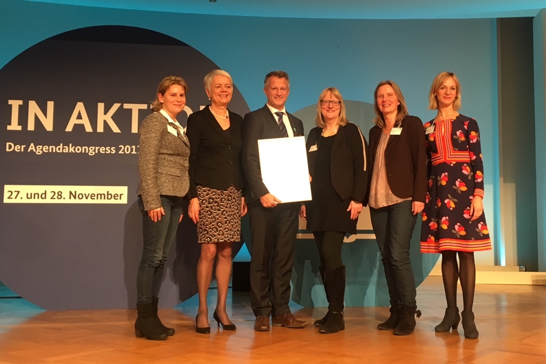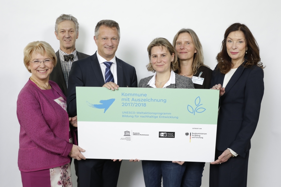 Insgesamt 63 Kommunen, Netzwerke und Lernorte zeichneten Cornelia Quennet-Thielen, Staatssekretärin im Bundesministerium für Bildung und Forschung, und die Präsidentin der Deutschen UNESCO-Kommission, Prof. Dr. Verena Metze-Mangold, am 27. November 2017 in Berlin aus. Die Ausgezeichneten tragen dazu bei, Nachhaltigkeit besser in der deutschen Bildungslandschaft zu verankern.