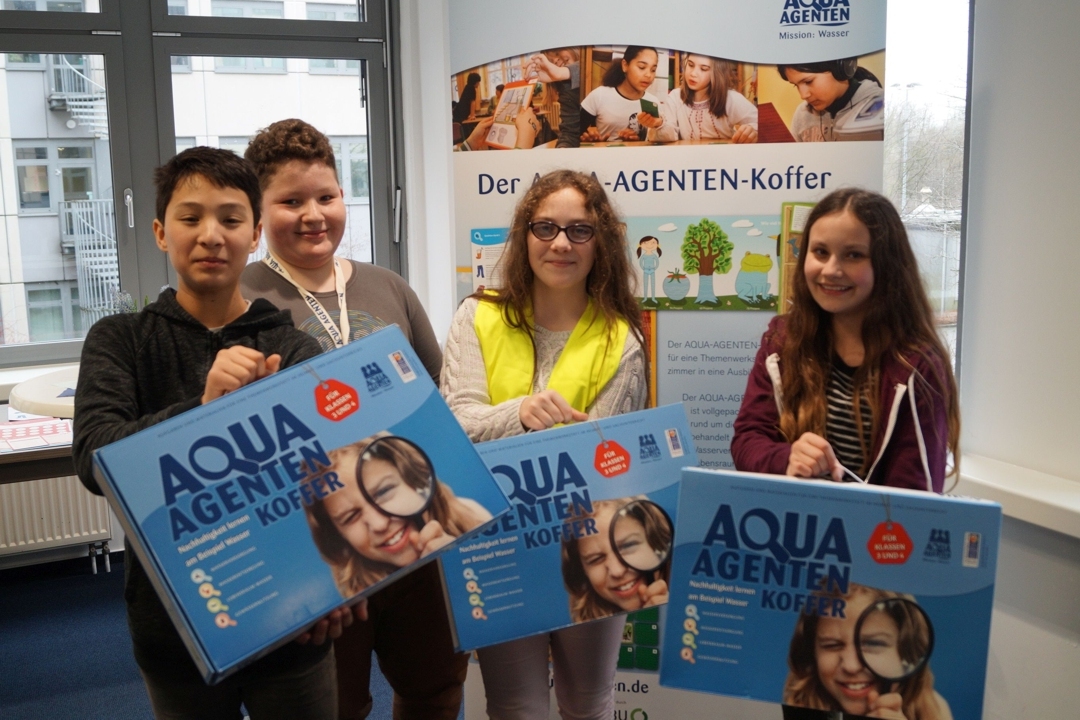 Bild 1: Alexander, Samir, Christina und Anastasia der 7b der Anne-Frank-Gemeinschaftsschule freuen sich über den Inhalt des Aqua-Agenten-Koffers