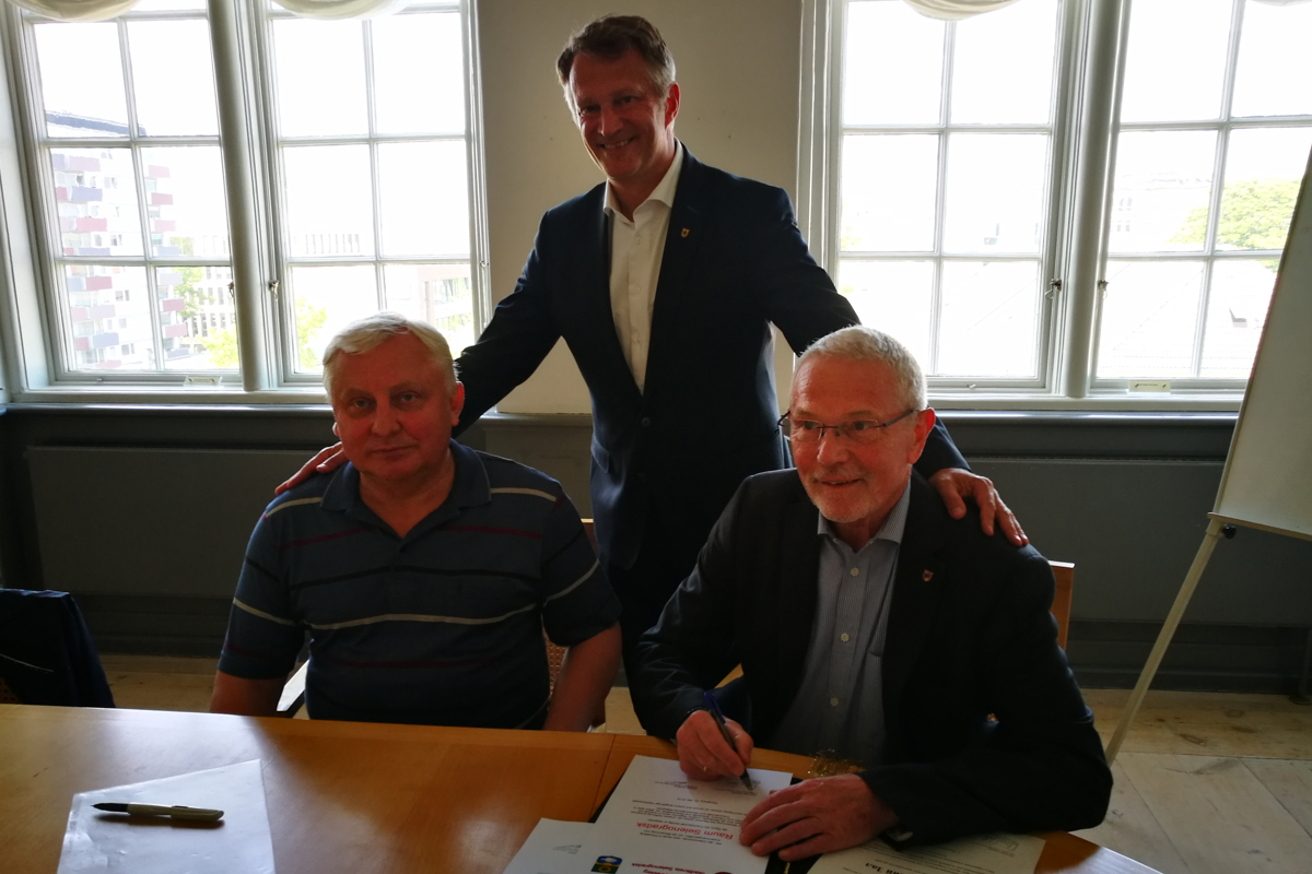 Bild Unterzeichnung Urkunden: (v.l.n.r.) Sergey Kulakov, Landrat Oliver Stolz und Kreispräsident Helmuth Ahrens bei der Unterzeichnung der Urkunden zur Benennung von Raum Selenogradsk als Raum der Freundschaft