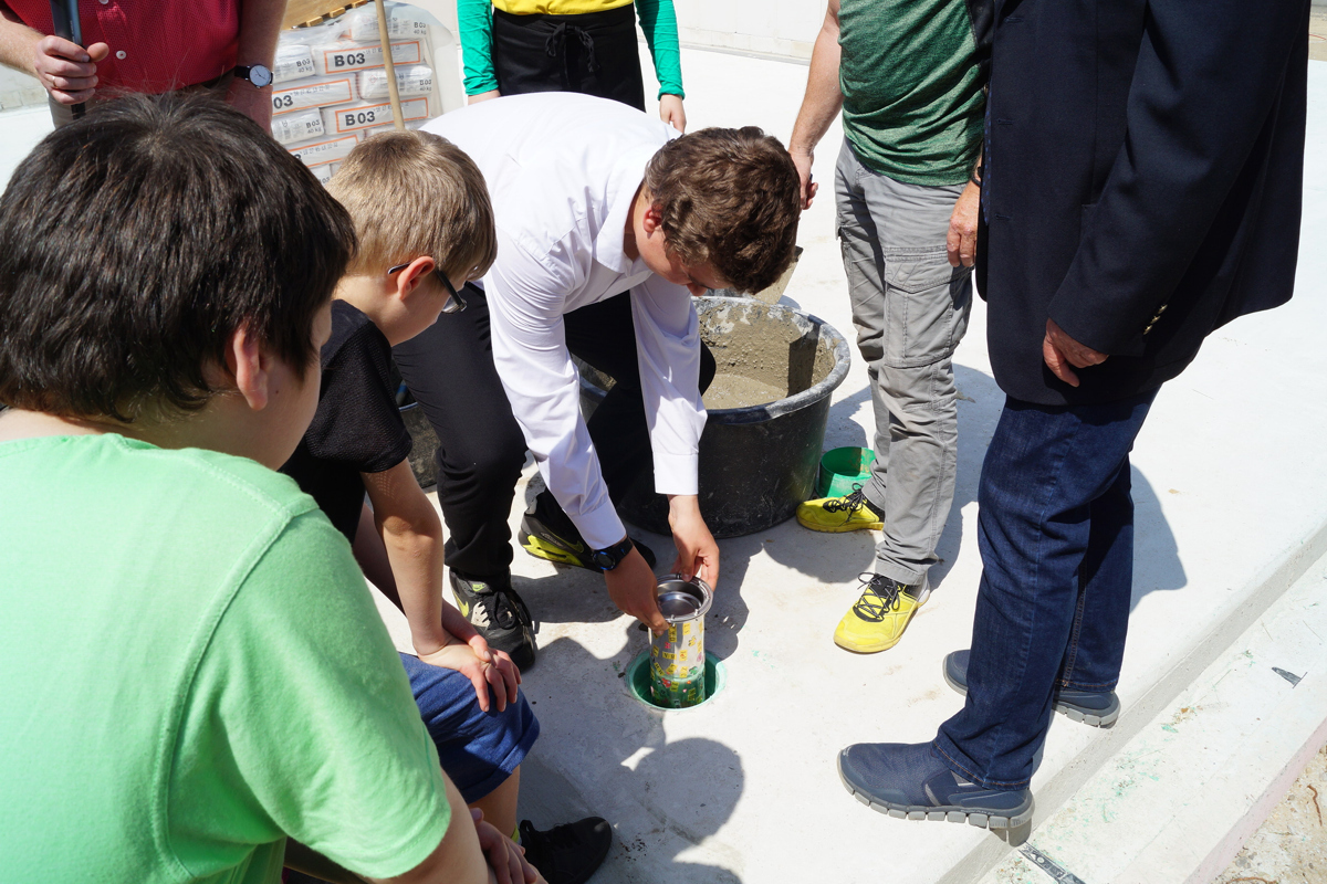 Im Anschluss wurde die „Zeitkapsel“ im Fundament des Gebäudes versenkt. In der Metallhülle befanden sich u.a. die Baupläne des Gebäudes sowie eine aktuelle Tageszeitung. Bereits vorher hatten sich viele Schüler auf der Zeitkapsel mit ihren aufgeklebten Initialen verewigt.