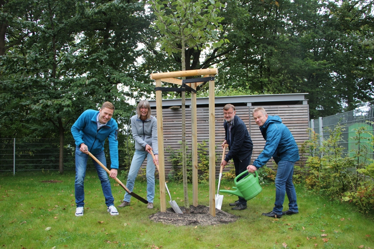„Mit dem Apfelbaum machen wir gleichzeitig den heimischen Insekten und Bienen sowie den Schülerinnen und Schülern eine Freude. Sie bieten Nahrungsmittel für beide.“ freut sich Schulleiter Jochen Worpenberg über den neuen Baum vor dem Fenster des neuen Seitentraktes der Heidewegschule.