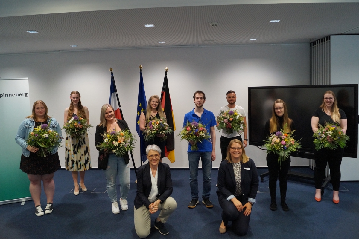 Fotohinweis (hinten v.l.n.r.): Paulina Sniehotta, Luca Benita Schiede, Anna Lena Wolf, Nele Jette Schümann, Marcus Guß, Thomas Morisch, Marie Zimmermann, Nele Tuschewski, (vorn kniend): Landrätin Elfi Heesch, Ausbildungsleiterin Melanie Gösch. Auf dem Bild fehlen: Nele Marie Marx, Nicklas Ropers