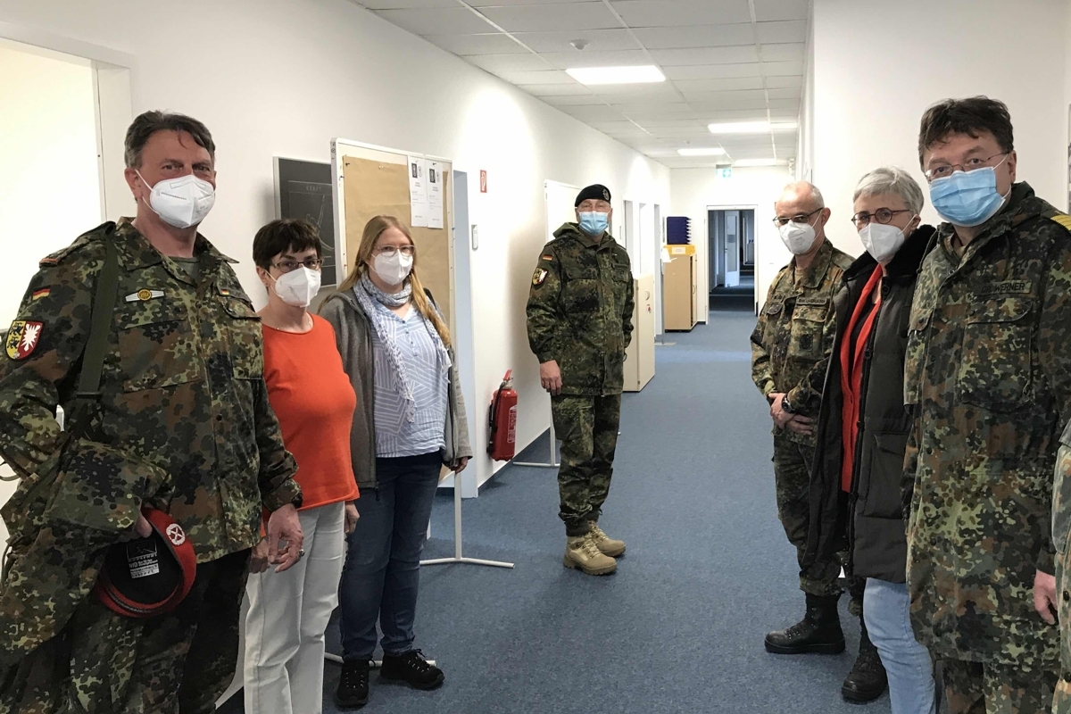 Im Gesundheitsamt: (v.l.n.r.) Oberst Wachholz, Dr. Angelika Roschning (Leiterin des Gesundheitsamtes), Dr. Ulrike Evermann (Abteilungsleitern Infektionsschutz), Oberst Schneider, Major Brüggemann, Elfi Heesch, Flottenapotheker Dr. Werner