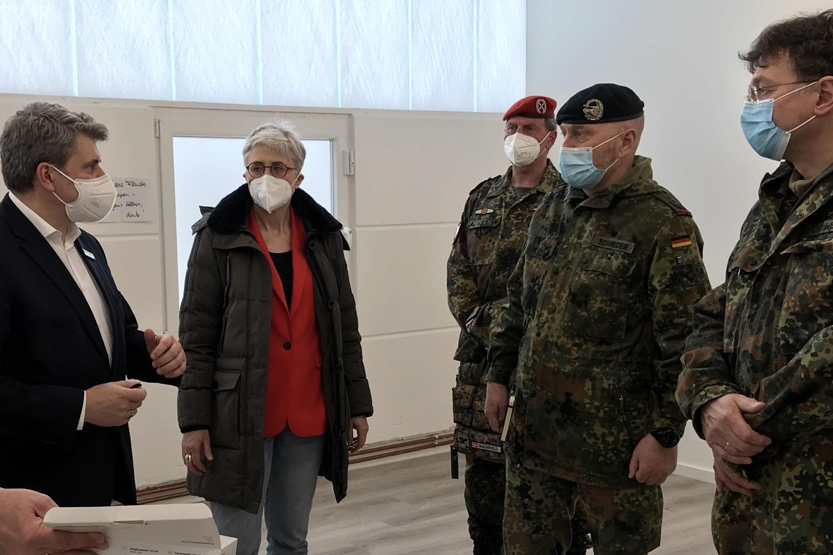 Oberst Axel Schneider möchte sich persönlich einen Eindruck von der Arbeit der Kameradinnen und Kameraden im Pandemie-Einsatz verschaffen. Dafür besuchte er gemeinsam mit Landrätin Elfi Heesch auch die Einheiten im Kreis Pinneberg. In einem gemeinsamen Gespräch mit den Einheitsleitern im Infektionsschutz und den Impfzentren im Kreis stellten sie fest, dass die Zusammenarbeit sehr gut funktioniert. „Wir sind sehr dankbar für diese Unterstützung. Die Zusammenarbeit läuft sehr gut. Die Kamerad*innen sind für uns in der Kontaktnachverfolgung und in den Impfzentren eine wichtige Säule.“ „Was für den Kreis aber sehr wichtig ist, ist eine Kontinuität der eingesetzten Kräfte“, betonten Heesch und Gesundheitsamtsleiterin Dr. Angelika Roschning.