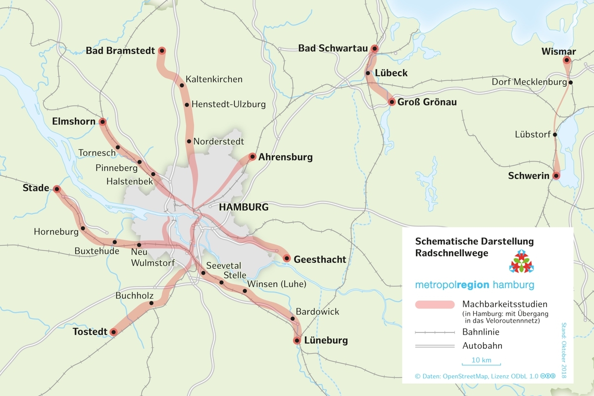 Die Zielpunkte der sieben auf Hamburg zulaufenden Radschnellwege liegen in Bad Bramstedt, Ahrensburg, Geesthacht, Lüneburg, Stade, Elmshorn und perspektivisch Tostedt. Sie sollen sich auszeichnen durch eine besondere Breite, um ein sicheres Überholen zu ermöglichen, aber vor allem auch durch nur sehr wenige Kreuzungen und Ampeln. Dadurch sollen Radfahrende von unterschiedlicher Geschwindigkeit jeweils deutlich schneller und komfortabler als bisher auch mittellange Strecken bewältigen können. Die Machbarkeitsstudien zu den einzelnen Strecken werden im Rahmen eines Leitprojekts der Metropolregion erarbeitet, an dem sich Hamburg aktiv beteiligt. Sie befinden sich aktuell kurz vor der Fertigstellung, das Projekt wird länderübergreifend von 13 Kooperationspartnern umgesetzt.