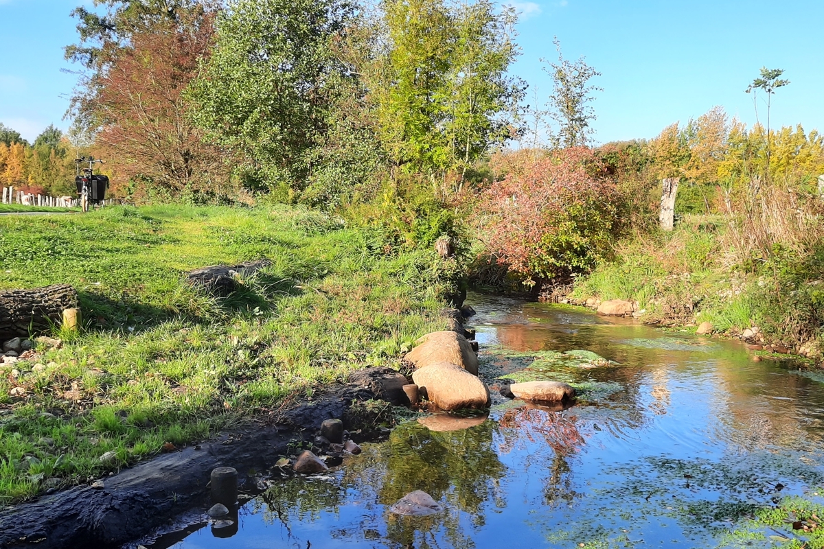 Am Wassererlebnispunkt wurden die senkrechten Uferwände entfernt und das Ufer abgeflacht. Während die Düpenau hier noch vor kurzem einem begradigten Entwässerungsgraben glich, dienen zukünftig Baumstämme sowie größere und kleinere Steine als Ufersicherung. Die Uferzonen werden zeitweise überstaut, so dass neue Lebensräume für Tiere und Pflanzen entstehen können. Von den neu platzierten Baumstämmen bzw. der neu aufgestellten Bank aus können Naturfans und Naherholungssuchende das Leben im Wasser ideal beobachten.