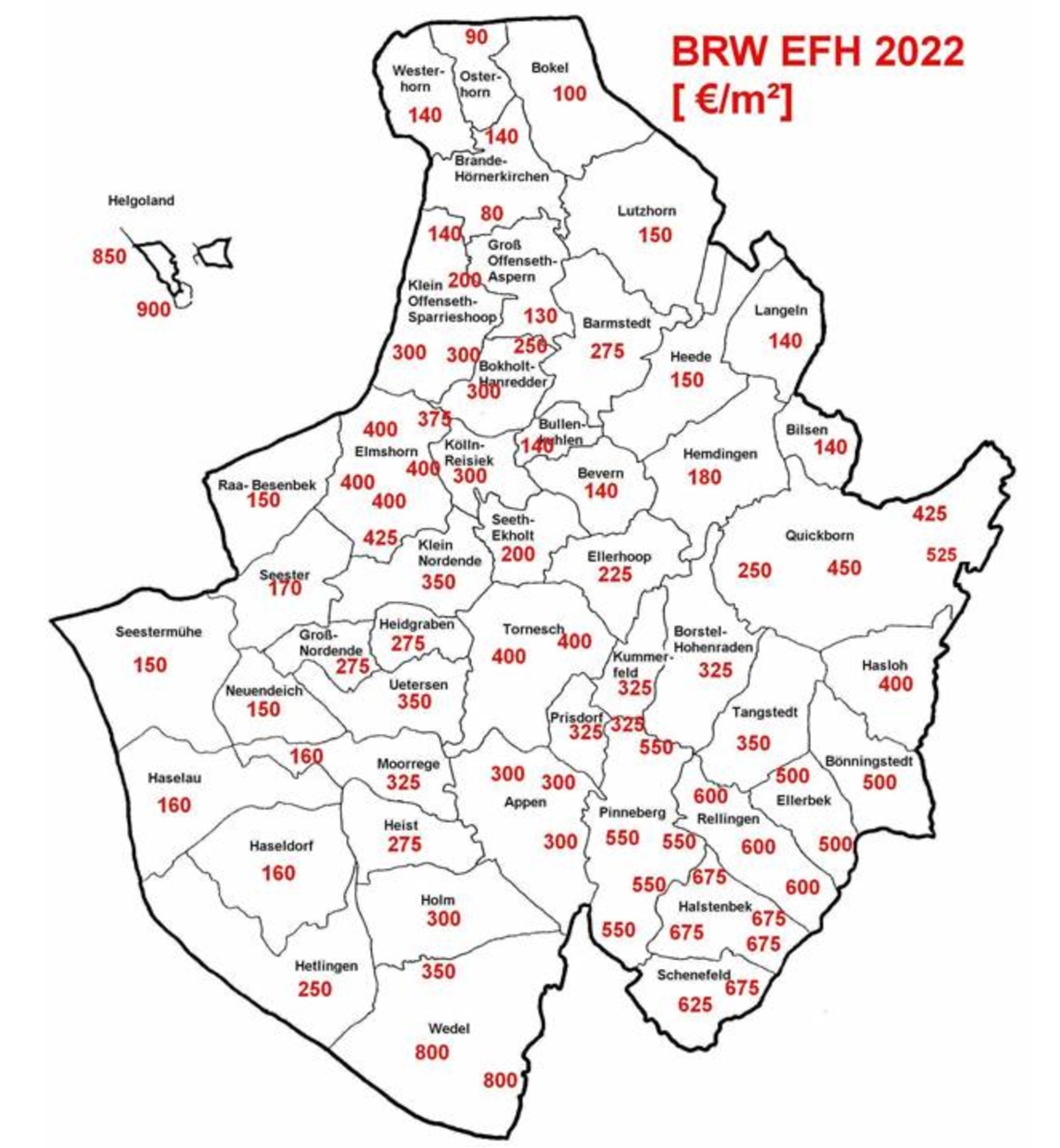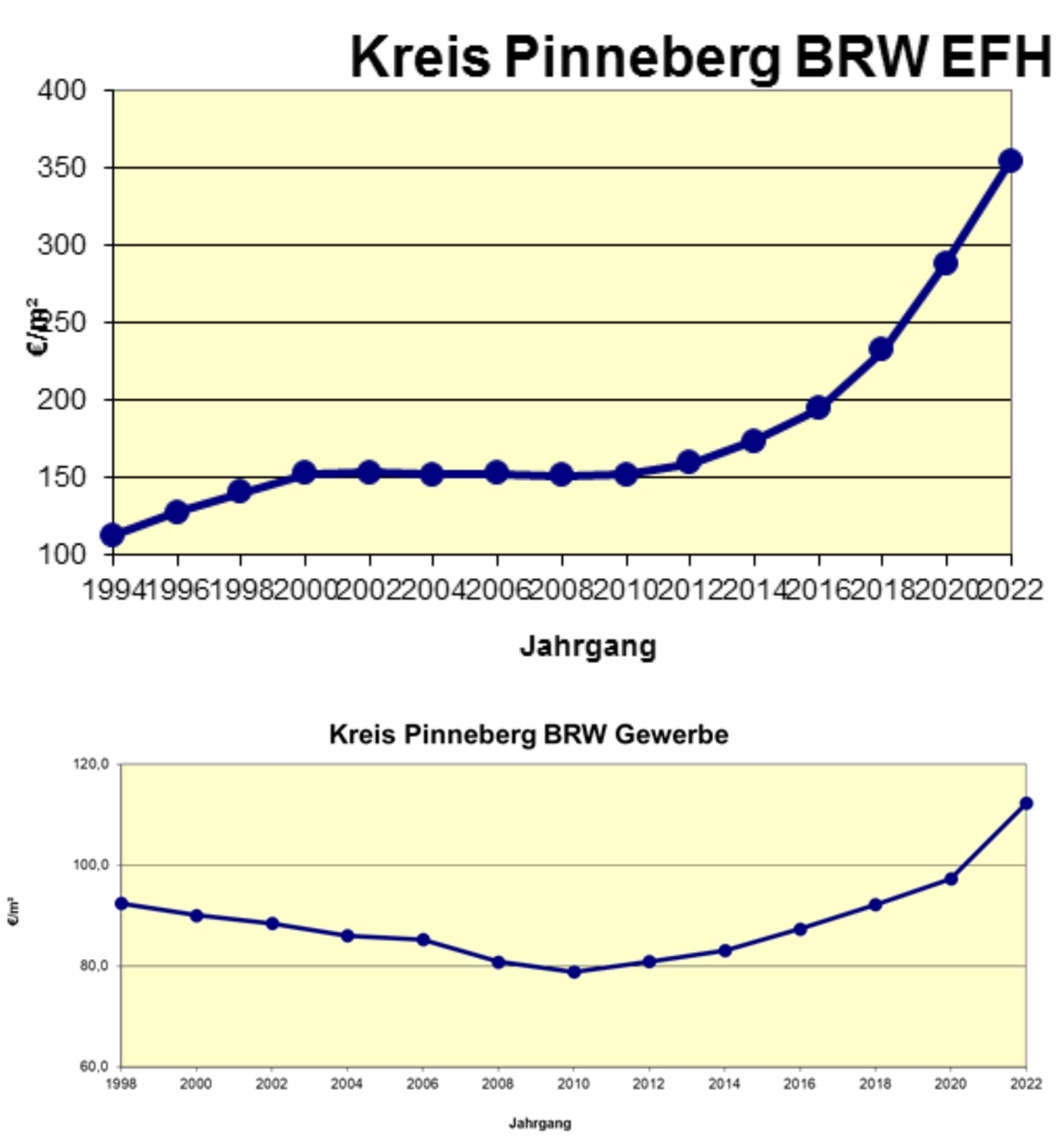 Der Gutachterausschuss für Grundstückswerte im Kreis Pinneberg hat die neuen Bodenrichtwerte für den Stichtag 01.01.2022 beschlossen. Für den Bereich der Wohnbebauung ergibt sich eine mittlere Steigerung des Bodenrichtwert-Niveaus in der Größenordnung von gut 20 Prozent und für die gewerblichen Bauflächen bei rund 15 Prozent in Bezug zu den letzten Bodenrichtwerten (Zeitraum ein Jahr).