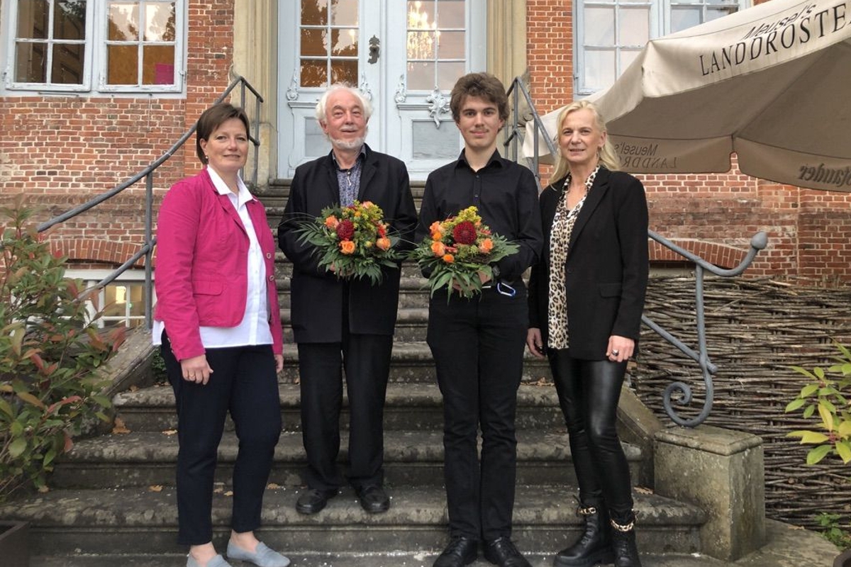 Foto: (v.l.n.r.) Stefanie Fricke, Vorsitzende der Kulturpreisjury des Kreises Pinneberg, Hans-Georg Kramer, Drosteipreisträger 2022, Benedikt Zimmer, Jugendförderpreisträger 2022, Kerstin Seyfert, Vorsitzende des Ausschusses für Schule, Kultur und Sport des Kreises Pinneberg.