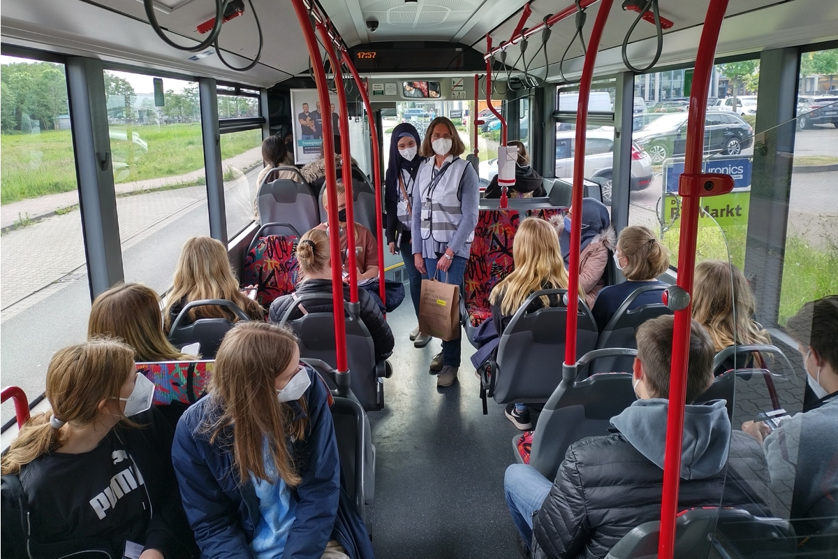 Begleitet von Auszubildenden und freiwilligen Helfenden ging es in insgesamt zehn Bussen und drei Fußgängergruppen auf JobTour.