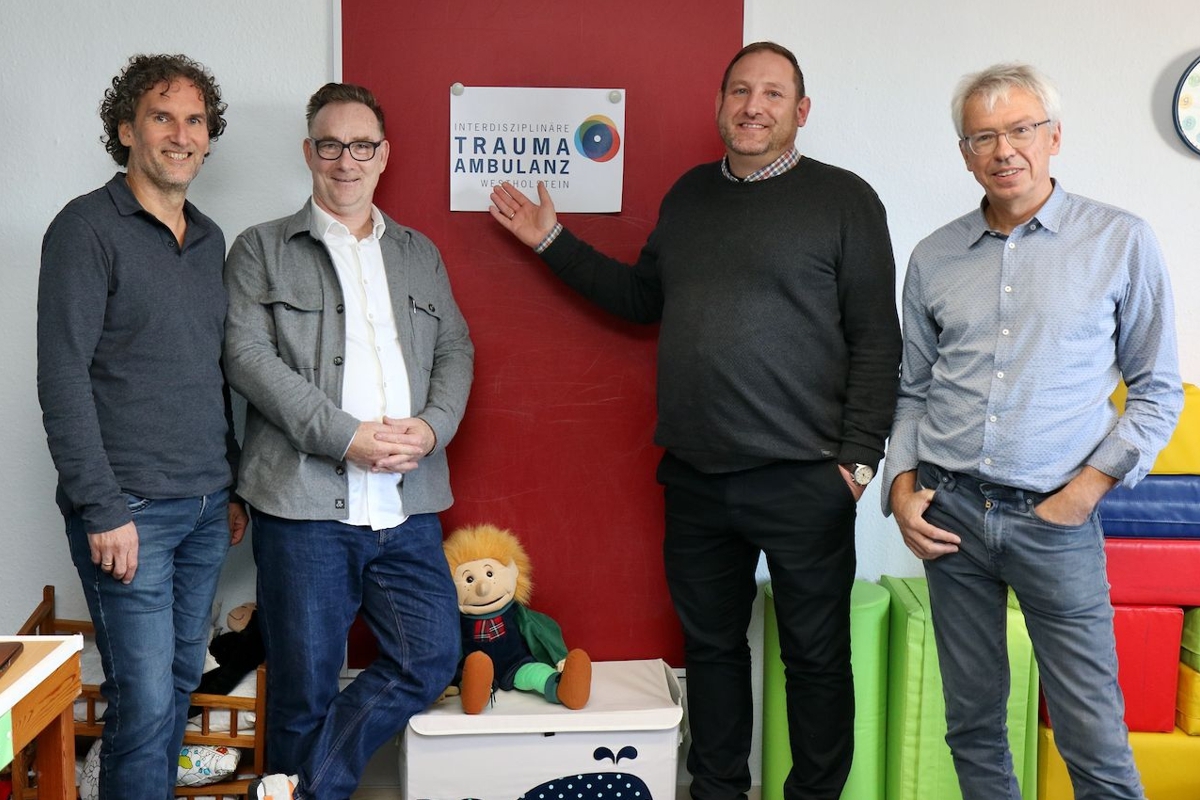 Foto in einem der Behandlungsräume (v.l.n.r.): Dirk Jacobsen, Geschäftsführer Wendepunkt e.V.; Ralph Kortewille, Leiter der Trauma-Ambulanz Regio Klinik; Sascha Niemann, Leiter der Trauma-Ambulanz Wendepunkt e.V.; Martin Keck, Leiter des Sozialpsychiatrischen Dienstes Kreis Pinneberg