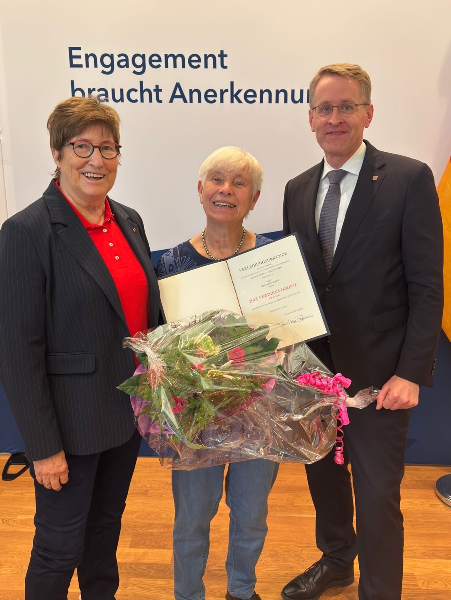 Bundespräsident Frank-Walter Steinmeier hat Irmgard Jasker aus Wedel mit dem Verdienstkreuz am Bande des Verdienstordens der Bundesrepublik Deutschland ausgezeichnet. Ministerpräsident Daniel Günther überreichte die Auszeichnungen am 21. April in der Landeshauptstadt Kiel. Als Gratulantin vor Ort war die Stellvertretende Kreispräsidentin Elke Schreiber dabei.