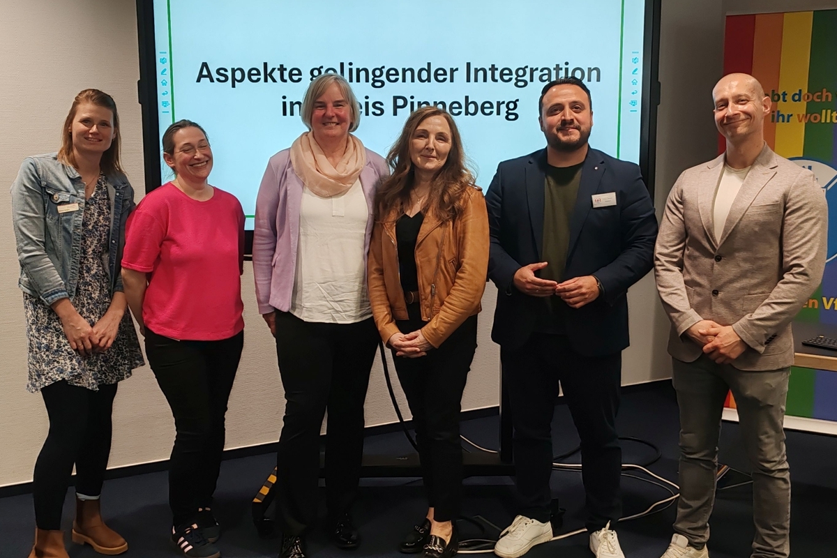 Bildinformation: (v.l.n.r.) Vanessa Mangels (Diakonie Rantzau- Müsterdorf), Raphaela Shorina (DiakoMigra ), Doris Kratz- Hinrichsen (Landesbeauftragte für Flüchtlings-, Asyl- und Zuwanderungsfragen), Anđa Zdravac-Vojnovic, Harun Öznarin (Einwandererbund e.V.), Michael Seeland (Kreis Pinneberg).