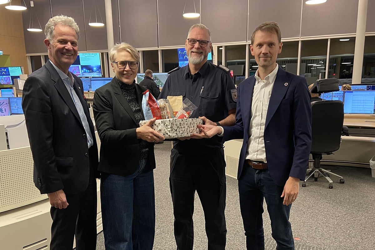 Für die Mitarbeitenden der Tagschicht in der Regionalleitstelle in Elmshorn war es eine leckere Überraschung. Landrätin Elfi Heesch aus dem Kreis Pinneberg und Landrat Jan Peter Schröder aus dem Kreis Segeberg waren am Dienstagabend zu einem vorweihnachtlichen Besuch gekommen, um symbolisch und stellvertretend einen Präsentkorb zu übergeben.